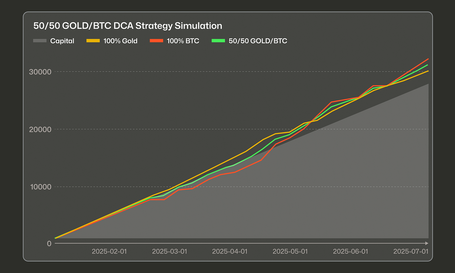 Below is a chart simulating a portfolio that's built with a “$BTC and $XAUm DCA strategy” that allocates $1,000 per week and compares its results with a single asset investment: